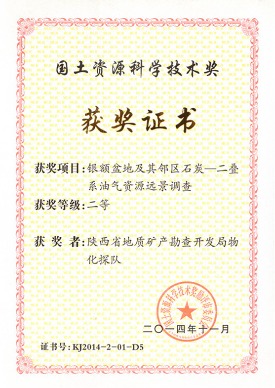 ? ? “銀額盆地及其鄰區石炭—二疊系油氣資源遠景調查項目”獲國土資源科學技術獎獲獎證書