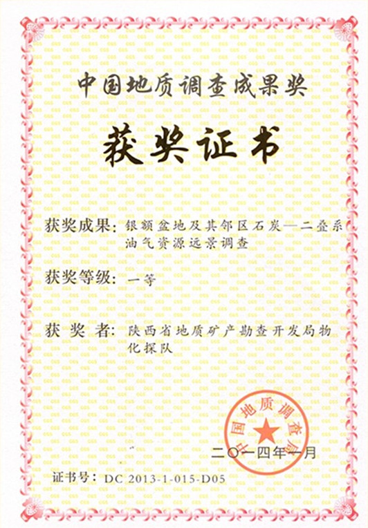 “銀額盆地及其鄰區石炭—二疊系油氣資源遠景調查項目”獲中國地質調查成果獎獲獎證書